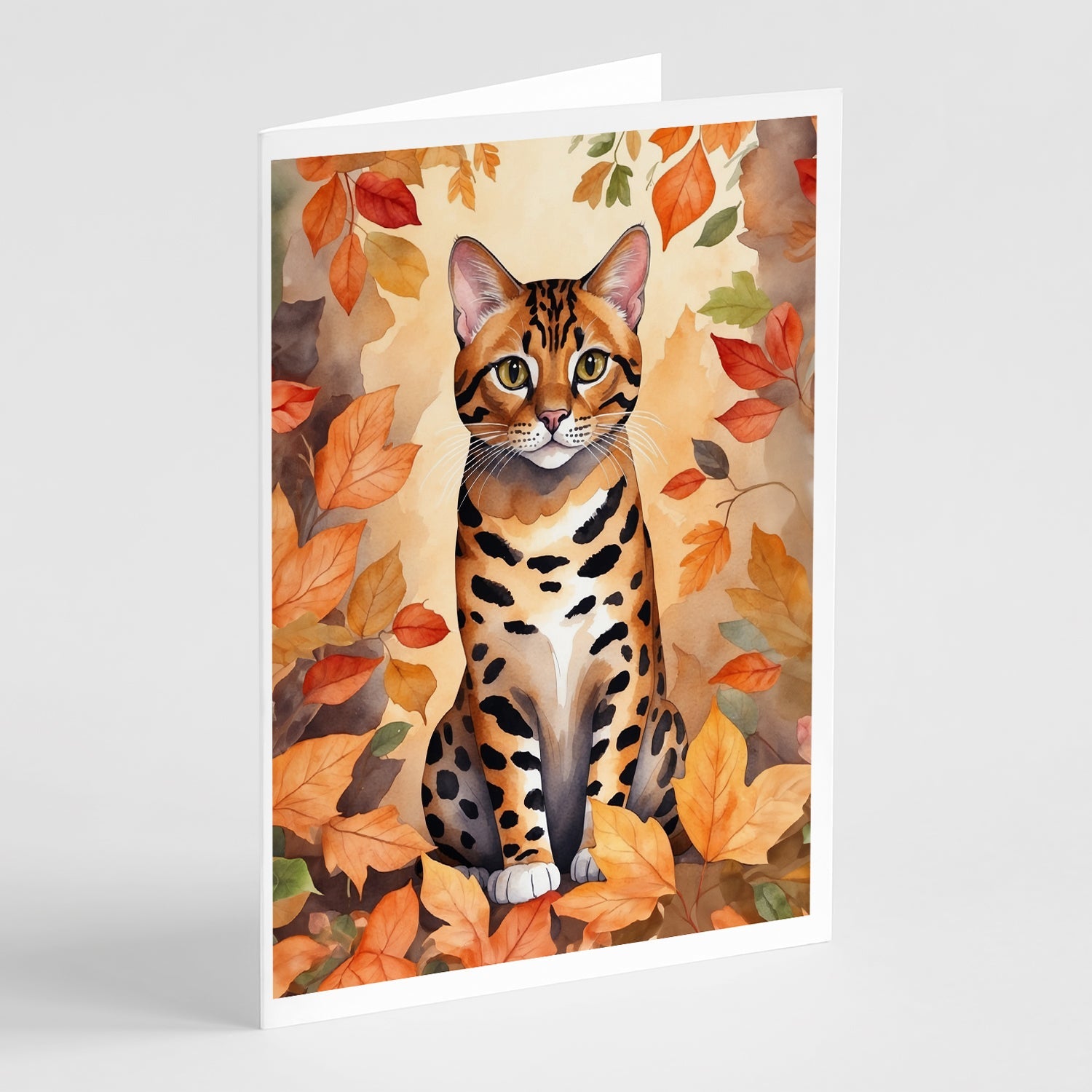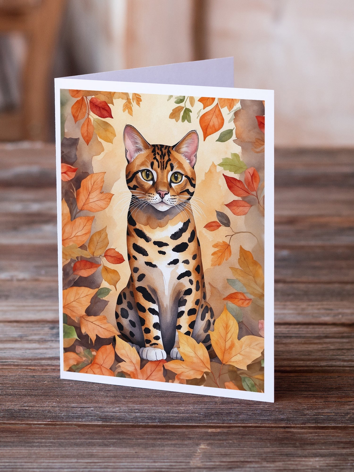Bengal Cat in Fall Leaves Greeting Cards Pack of 8