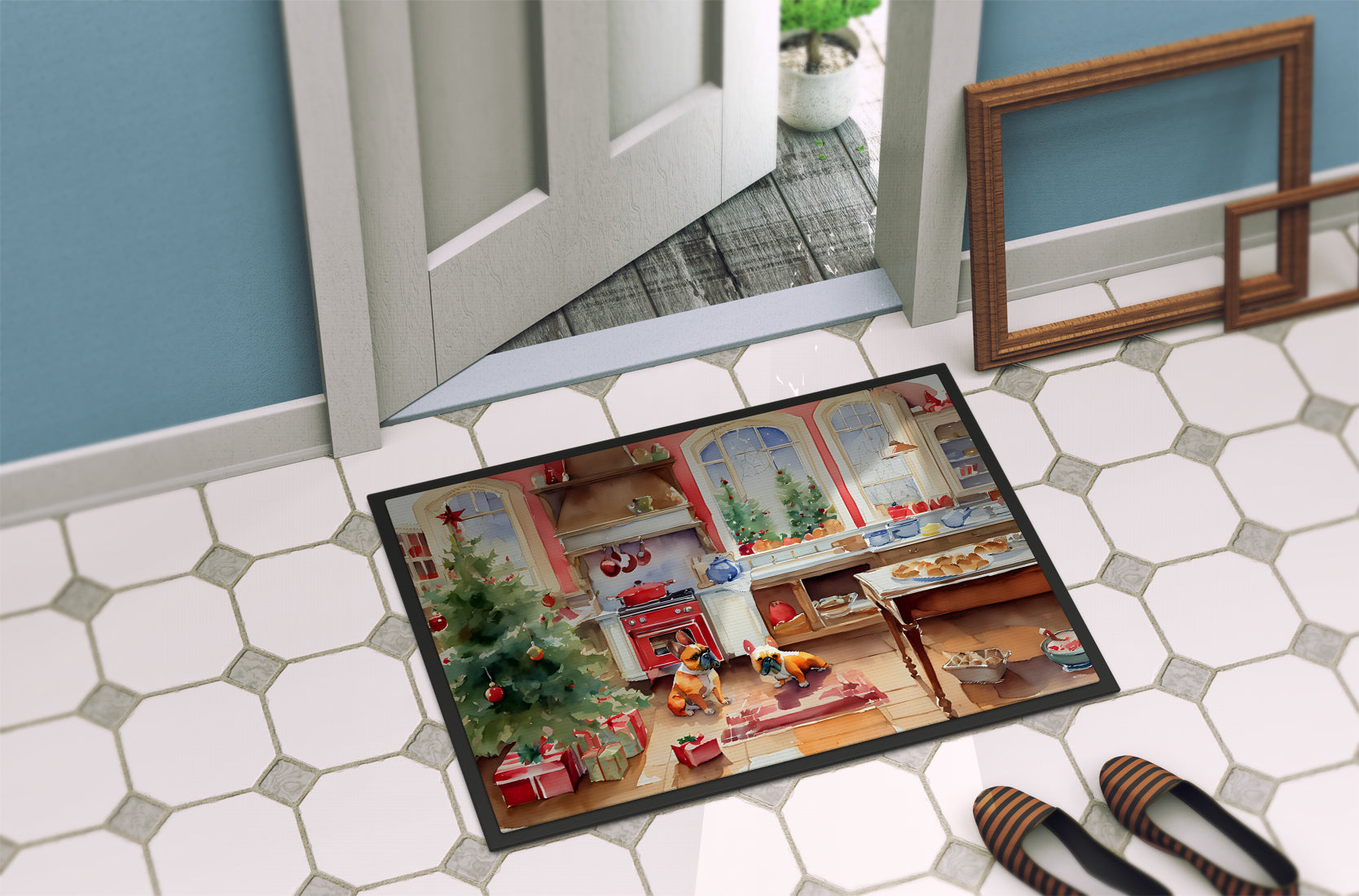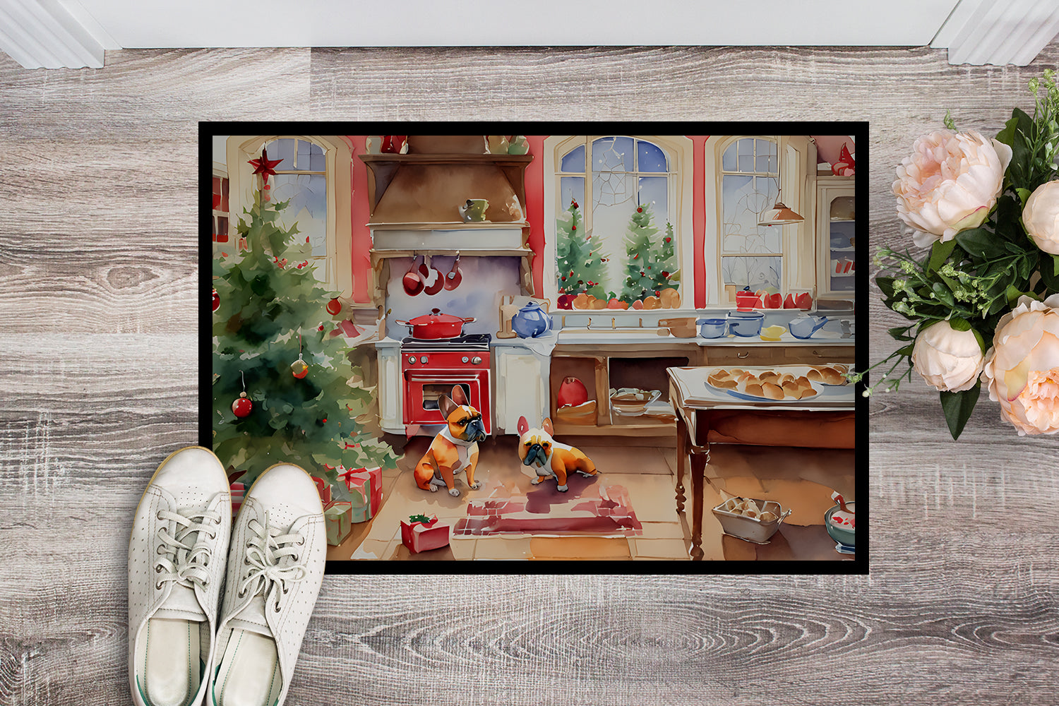 Doormat featuring breed specific French Bulldog artwork. Celebrate Christmas with this Christmas Doormat. Welcome your guests in style with our Artwork Door Mat, designed to withstand almost any weather condition. This mat, measuring approximately 18 by 27 inches, is held together by durable black binding tape. Its top layer, composed of polyester felt, is dyed with the eye-catching image you see on the mat. A few layers below provide the mat with stability, while its rubber bottom is stamped to help prevent slipping and ensures safety. Our mat works wonderfully as both an indoor or outdoor door mat. For cleaning, simply hose it off with water or use a power washer - no need for any cleaner that produces suds. Avoid scrubbing with a brush, instead, opt for the vacuum on floor setting. Designed manufactured and printed in the USA, this mat is a perfect addition to your porch, outdoor kitchen, entryway, or any indoor space. Its unique design makes it a charming decorative rug that greets your guests and adds a stylish touch to your home decor.