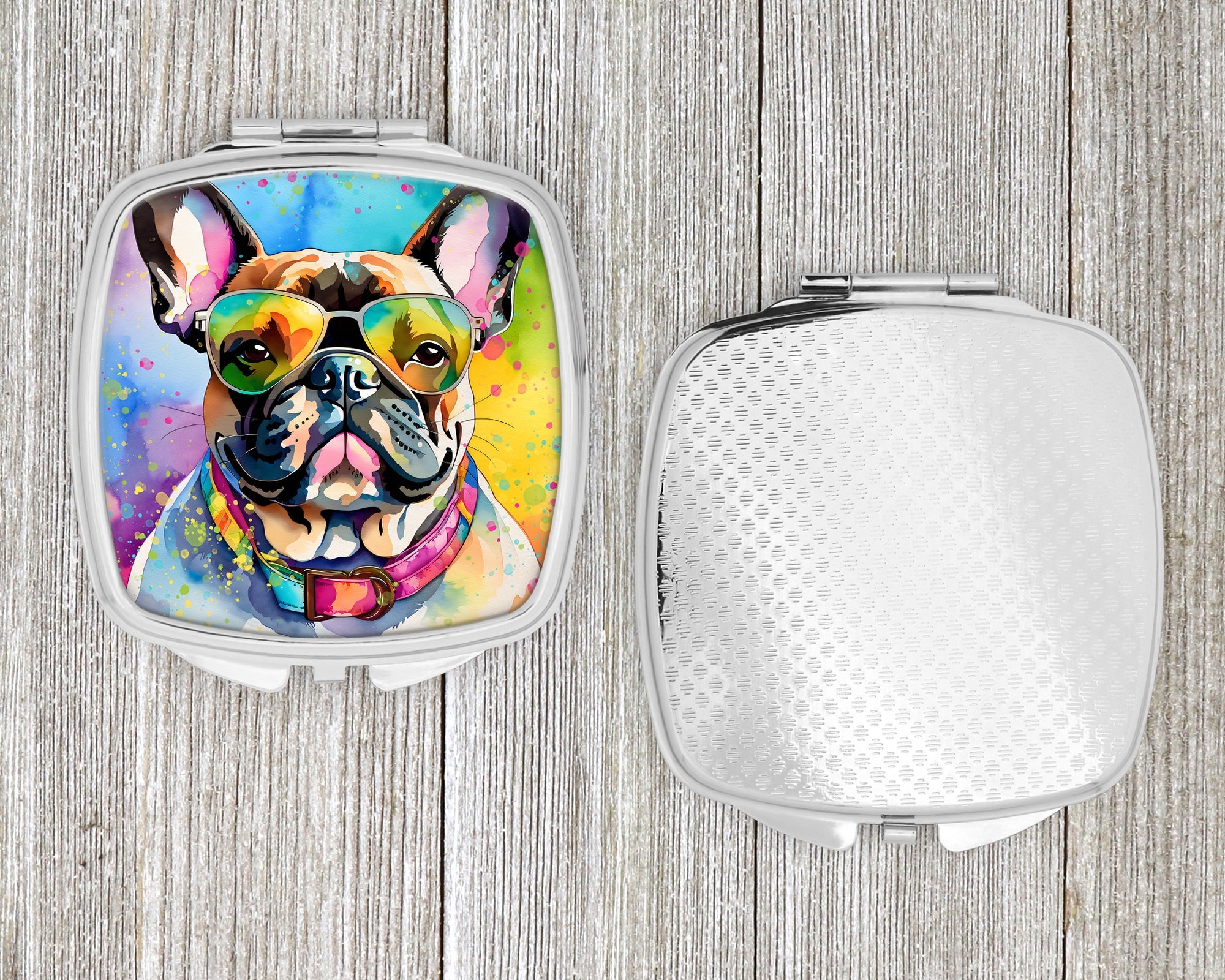 Compact Mirror featuring breed specific French Bulldog artwork. Introducing our Square Compact Mirror, a blend of elegance, functionality, and compactness, perfect for on-the-go touch-ups. This Silvertone metal mirror, with dimensions of 2.75 inches x 3 inches x .3 inches, fits effortlessly into your purse, handbag, or pocket, ensuring that you can check your appearance anytime, anywhere. Our compact mirror stands out with its eye-catching artwork on the front, adding a dash of style to this practical accessory. It is more than just a mirror; it's a statement piece that reflects your personality and aesthetic. When opened, this compact reveals two mirrors inside, doubling your perspective for precise touch-ups. The Silvertone metal construction ensures durability while maintaining a lightweight feel, making it an ideal everyday carry item. Whether you're rushing to a meeting, prepping for a dinner date, or just need a quick check on your look, our Square Compact Mirror is your reliable companion. Experience the perfect blend of style and practicality with this must-have accessory.