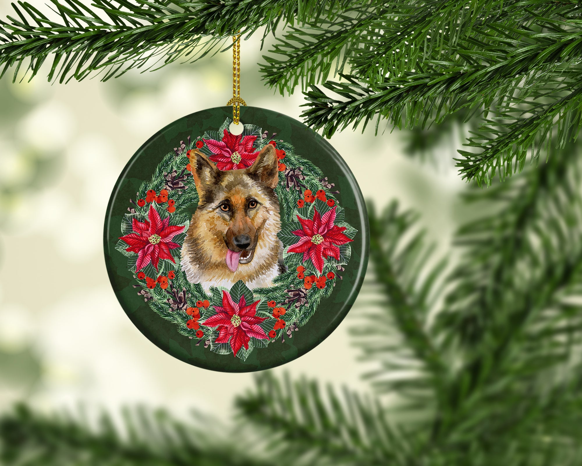 German Shepherd Poinsetta Wreath Ceramic Ornament