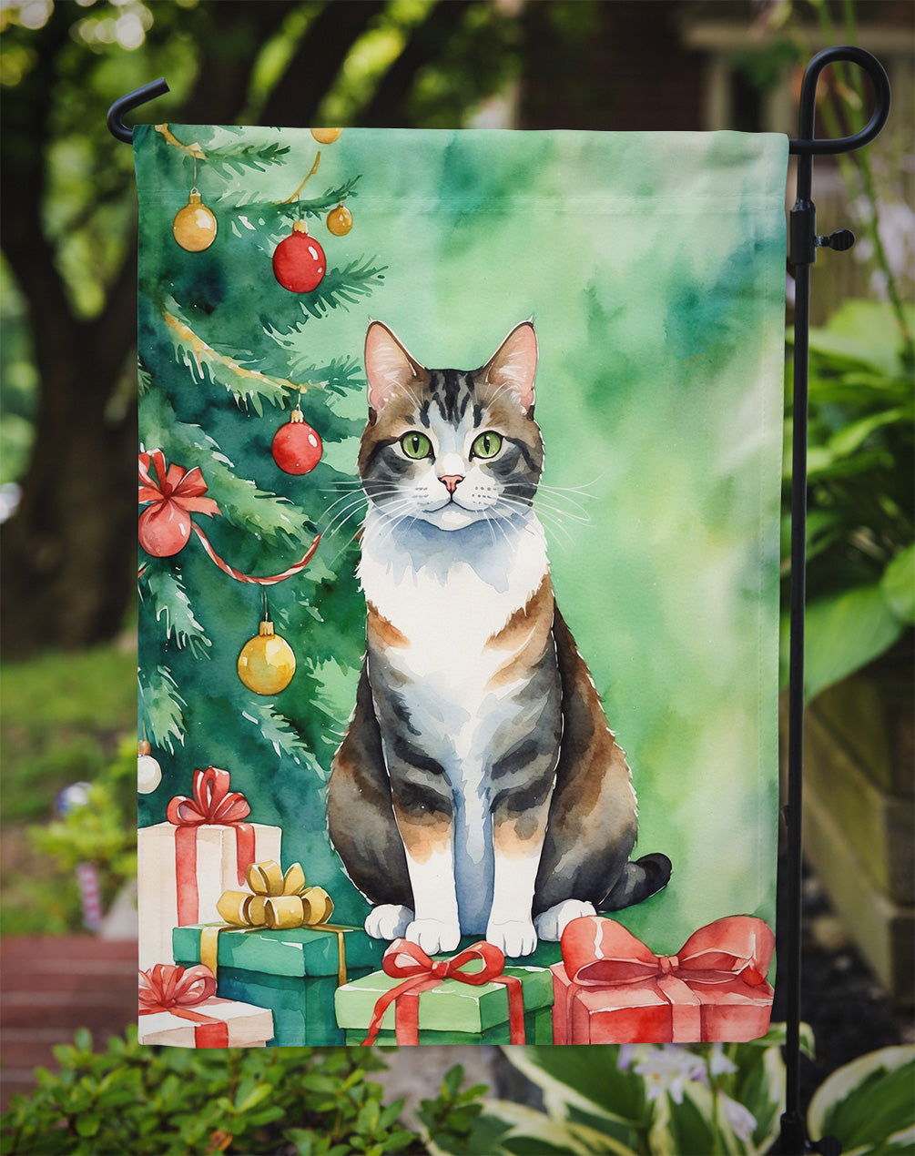 Manx Cat by the Christmas Tree Garden Flag