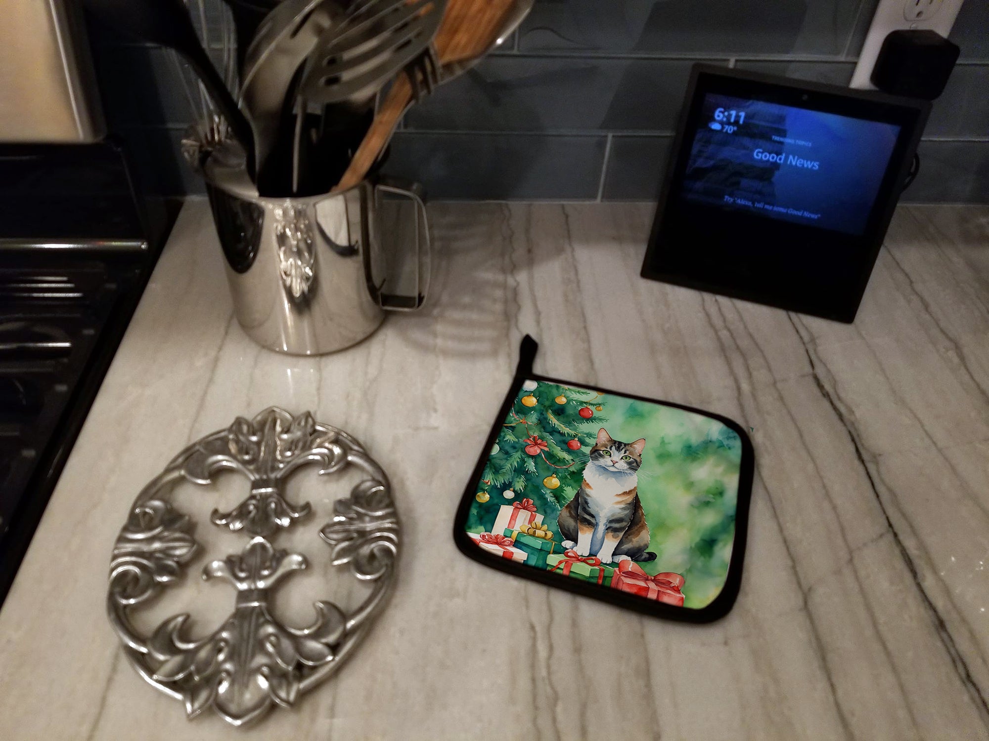Manx Cat by the Christmas Tree Pair of Pot Holders