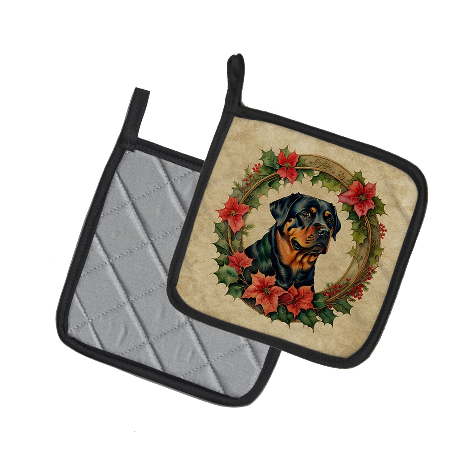 Rottweiler Christmas Flowers Pair of Pot Holders