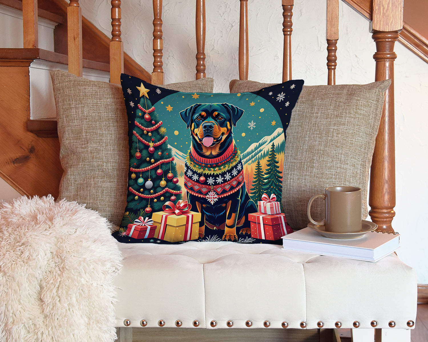 Throw Pillow featuring breed specific Rottweiler artwork. Celebrate Christmas with this Christmas Pillow. Add a touch of vibrancy and comfort... Read more