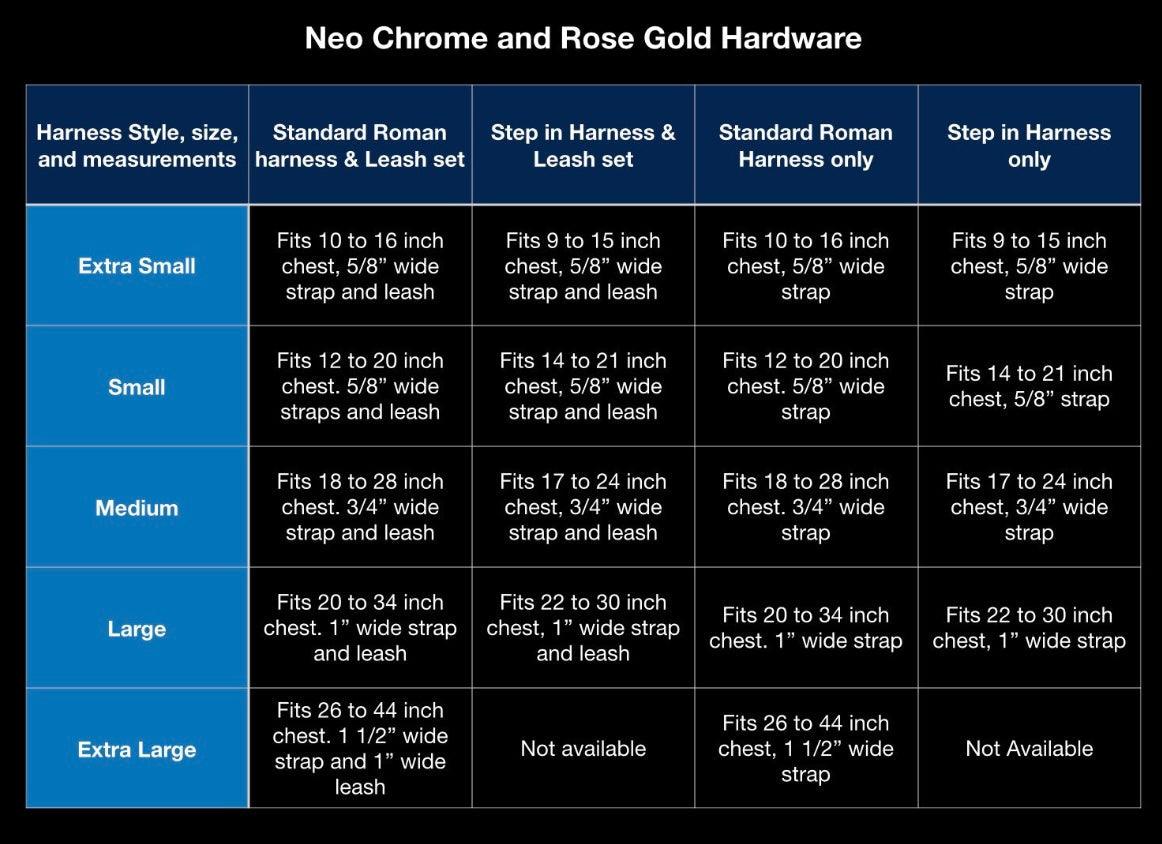 Extra Small fits 9'-15" chest Girth - comes in 1/2” width strap - avg weight max 10 lbs full grown.